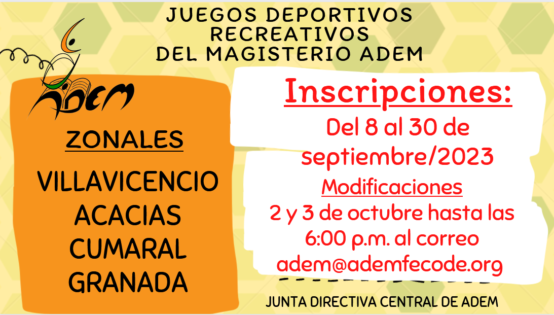Del 8 de septiembre al 30 de septiembre de 2023 están abiertas las inscripciones para los juegos del magisterio organizados por Asociación de Educadores del Meta ADEM. El evento deportivo se llevará a cabo del 1 al 4 de noviembre en los diferentes zonales con sedes en los municipios de Villavicencio, Acacias, Granada y Cumaral como ha sido habitual en los últimos años.